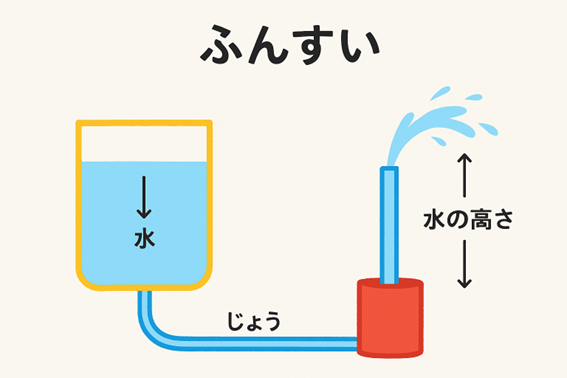 要するに、水面の高さ(タンクの位置)が高いほど噴き出す水も高くなるというわけです。