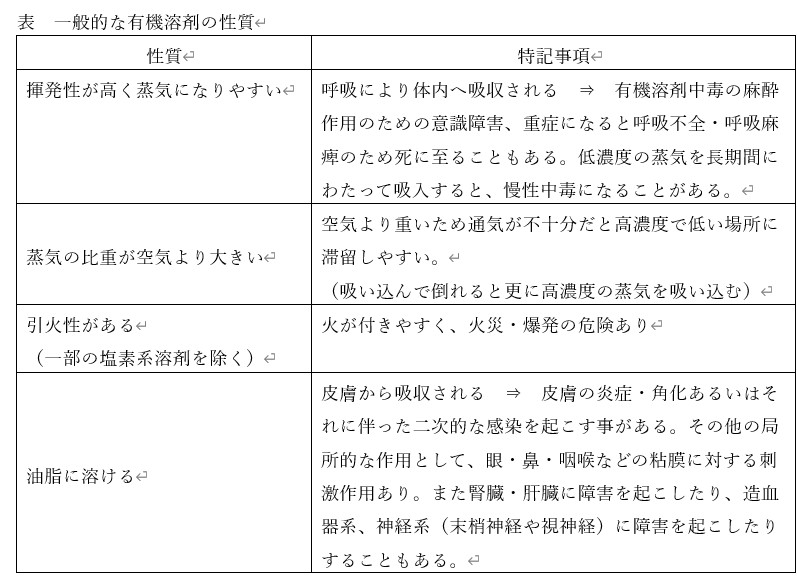 表に一般的な有機溶剤の性質を示し、なぜこのような注意が必要かをまとめます。