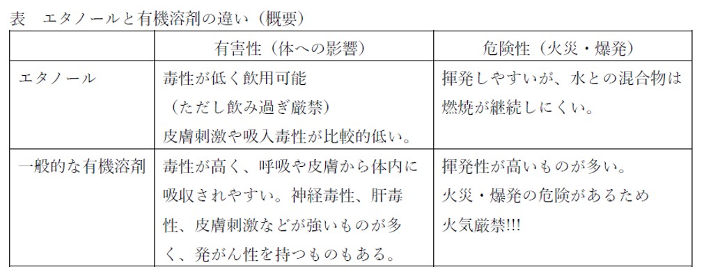 このように、エタノールと一般的な有機溶剤では体に吸収しても問題がない量(毒性)に違いがあること、