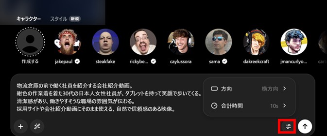 縦動画か、横動画、時間10秒か15秒を選択し「↑」を押すと実行されます。