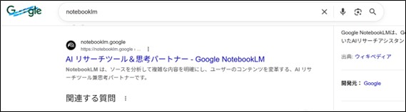 - Googleの検索窓に「NotebookLM」と入力して検索。