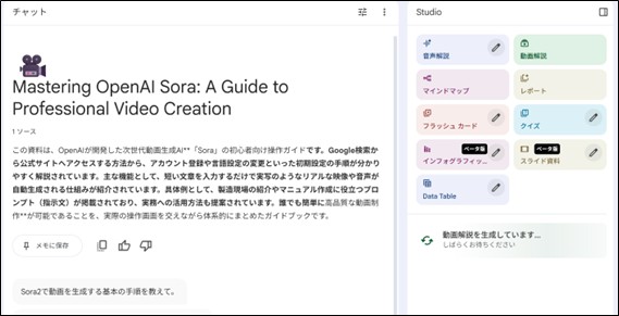 すると、右下に「動画解説を生成しています…」と矢印がくるくる回っているとおもいますので、数分待ってみてください。