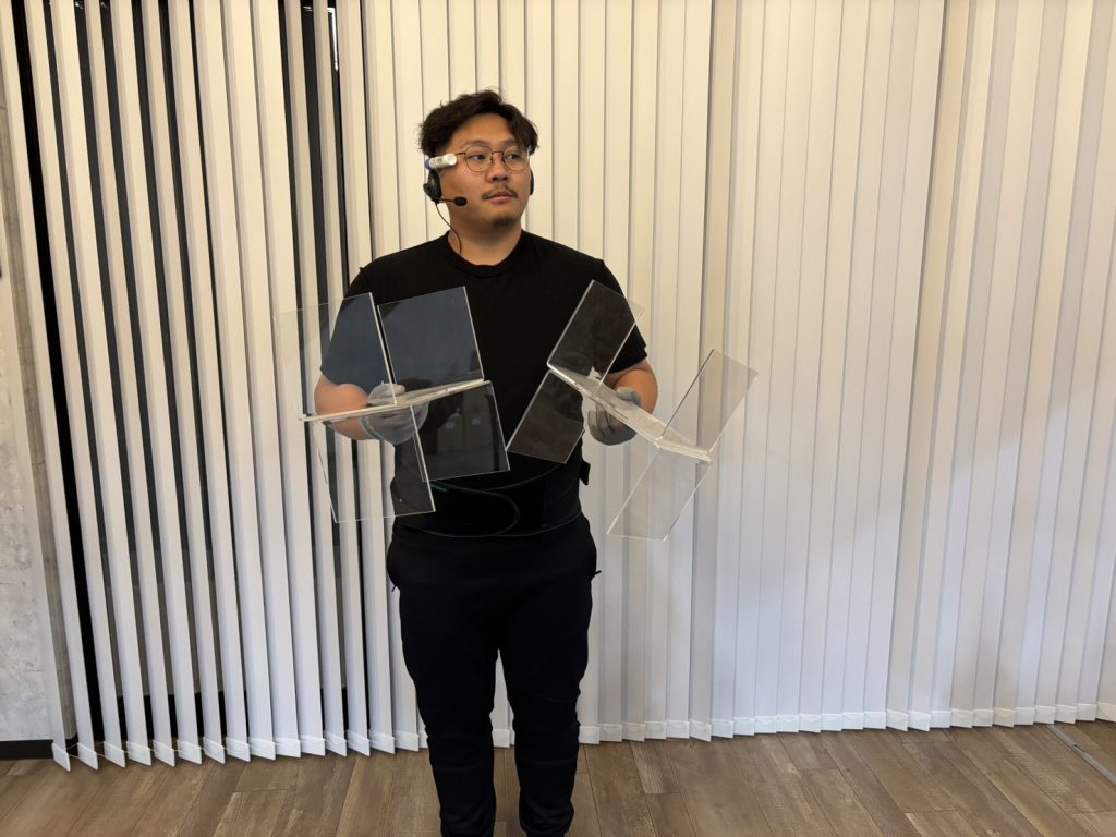 宙吊りにされながらの、パソコンっぽい機械の操作です。